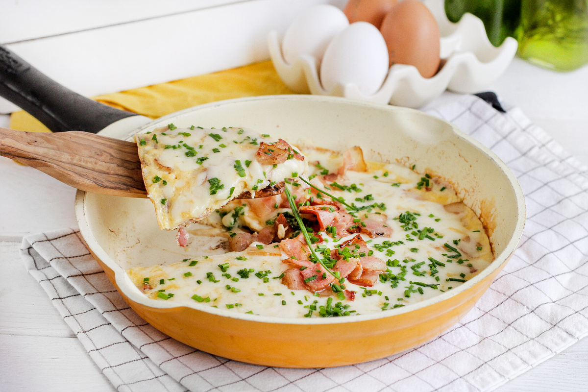 Готовится он за считанные минуты: обжаренный бекон как база, затем яйца, молоко и щепотка специй, чтобы масса была нежной и воздушной. Сверху — щедрая посыпка чеддера, которая плавится и соединяет все вкусы в одном гармоничном аккорде. Зеленый лук добавляет свежую нотку и лёгкую зелёную концовку