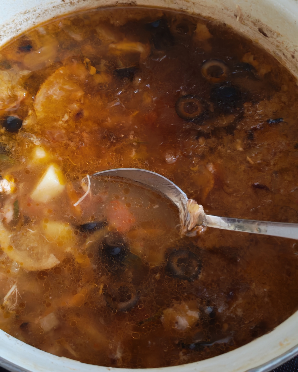 Понедельник начался с простой солянки, сваренной из того, что лежало в холодильнике. В списке ингредиентов — мясо, лук, морковь, маслины и пара огурцов. Получилось насыщенно и быстро, без лишних походов по магазинам.
