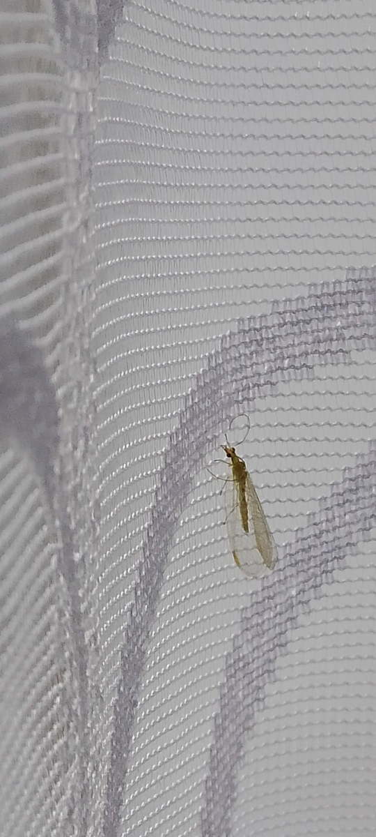 В связи с нехваткой времени для работы на ноутбуке и доступа к старым фотографиям, свежие моменты будут запечатлены на телефон. Совсем недавно, стоя на кухне за приготовлением блюда, автор заметила на тюле златоглазку обыкновенную – привычное существо из детства. Она появилась в тот момент, когда учёба почти заканчивалась, и этот момент прочно запомнился в памяти.