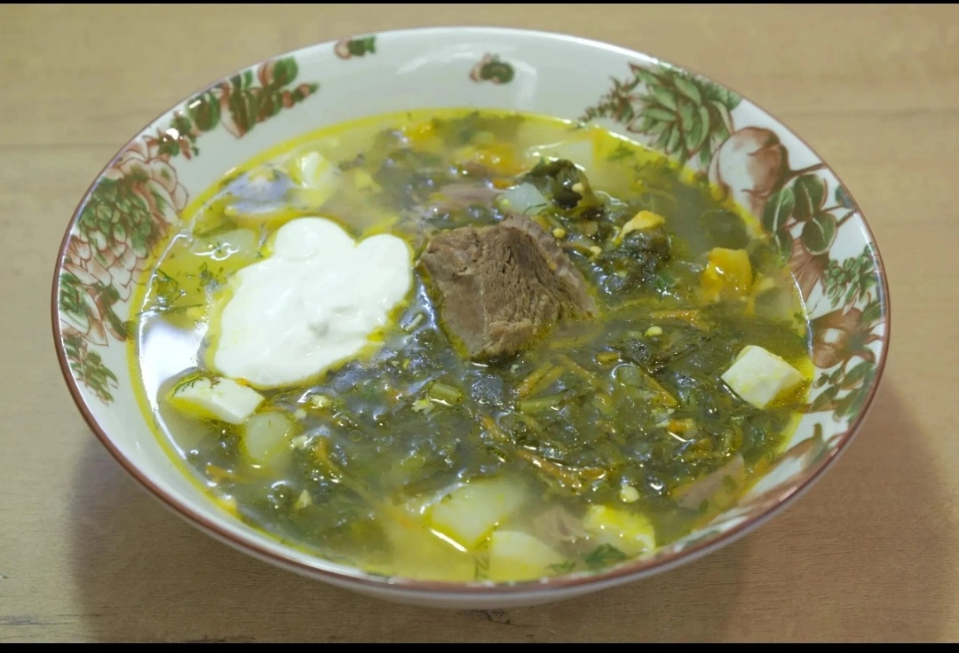 После того как картофель сварится, в бульон добавляют зажарку, нарезанное мясо, яйца и щавель. Дождавшись, когда суп закипит, добавляют зелень и дают настояться около 15 минут. Подавая к столу, не забудьте украсить порцию сметаной для дополнительного вкуса.