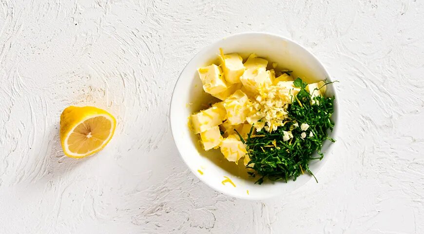 Сначала займитесь подготовкой лимонно-чесночного масла. Достаньте сливочное масло и дайте ему размягчиться при комнатной температуре. Затем натрите чеснок на терке, а петрушку мелко порежьте, слегка приправив ее солью, перцем, лимонной цедрой и соком. Эти ингредиенты нужно тщательно смешать, чтобы получить ароматную массу. Дайте ей настояться на столе.