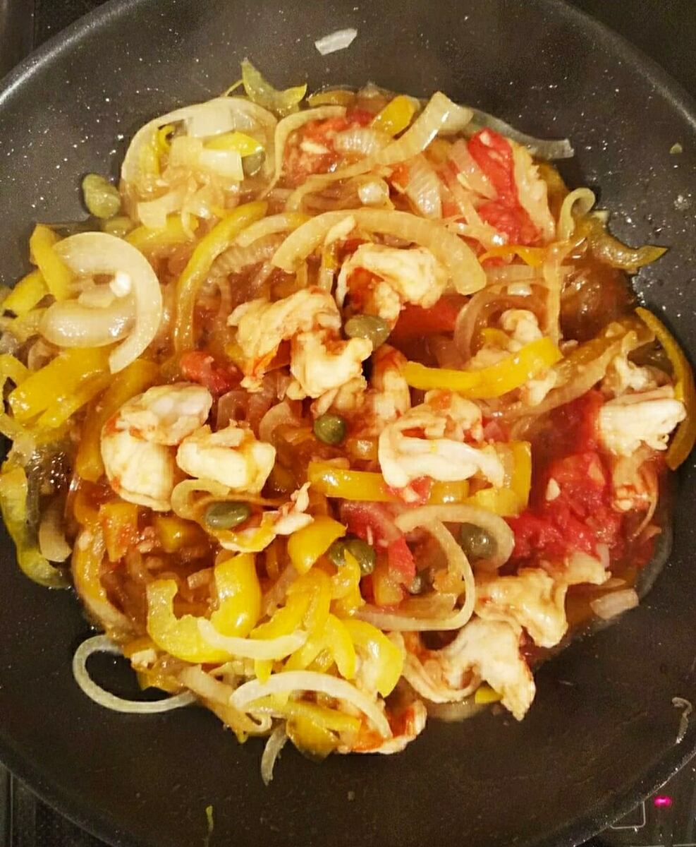 На разогретой сковороде или в воке обжарить рыбу, перец и лук до готовности. В завершение добавьте помидоры, каперсы и чеснок, не забудьте присолить и поперчить по вкусу.