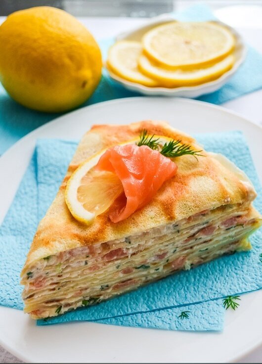 Теперь ваш блинный торт готов к подаче! Украсьте его оставшимися кусочками рыбы и дольками лимона – и ваше творение поразит всех гостей!
