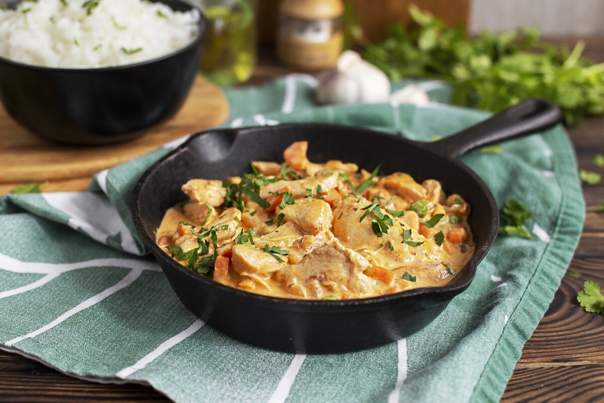 - Приготовление курицы: Очистите морковь, нарежьте ее и лук кубиками около 1 см. Чеснок мелко нарежьте. Разогрейте сковороду с 1 столовой ложкой масла. Обжаривайте курицу 3-4 минуты, после добавьте лук, морковь и чеснок, обжаривая еще 4-5 минут. Введите пасту карри по вкусу, тщательно перемешайте, добавьте сметану и горошек. Приправьте по вкусу и готовьте 3-5 минут, при необходимости добавьте немного воды. Подавайте с рисом, посыпав зеленью.