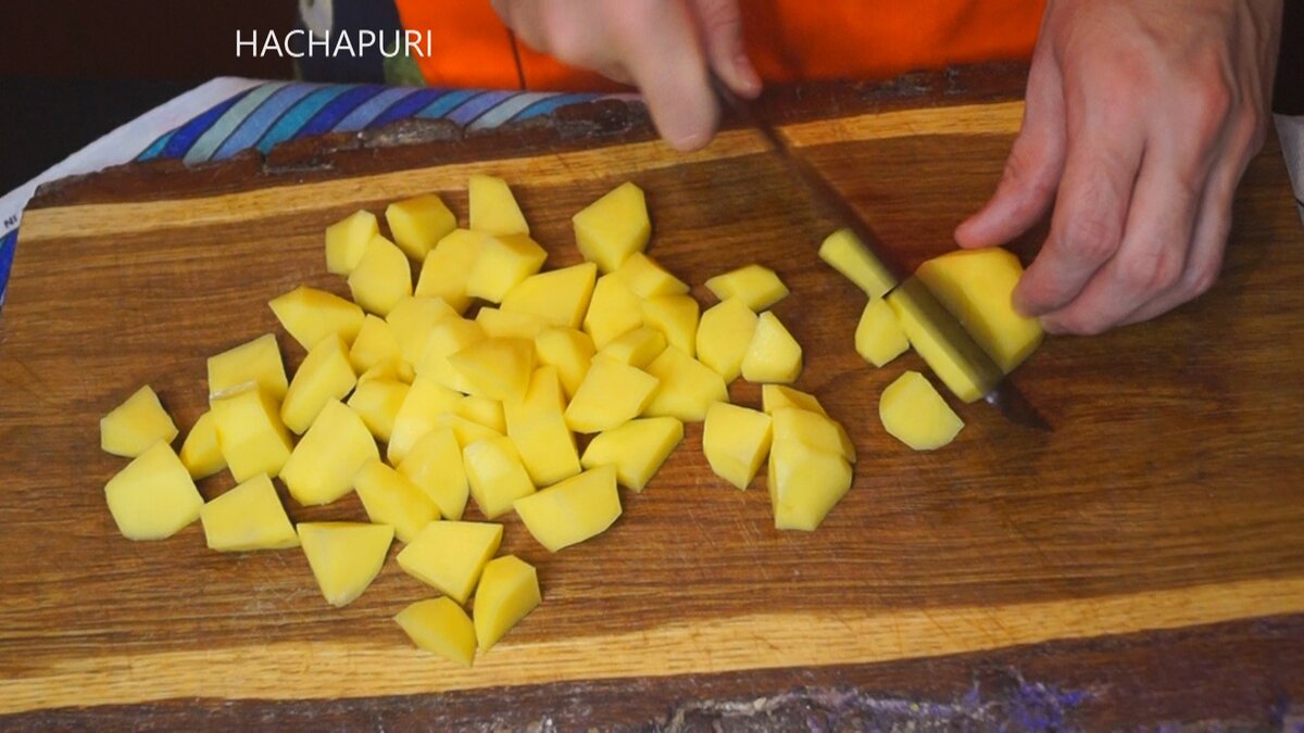 4. Спустя 10 минут, воду из картофеля слить и тщательно просушить. Шкварки посолить и поперчить.