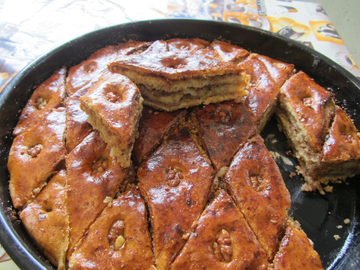 6. Дайте тесту немного подняться, затем отправляйте в разогретую до 180°C духовку на 30–40 минут. За 5 минут до готовности, полейте пахлаву медовым сиропом из 150 г меда и 100 мл воды для сладости.
