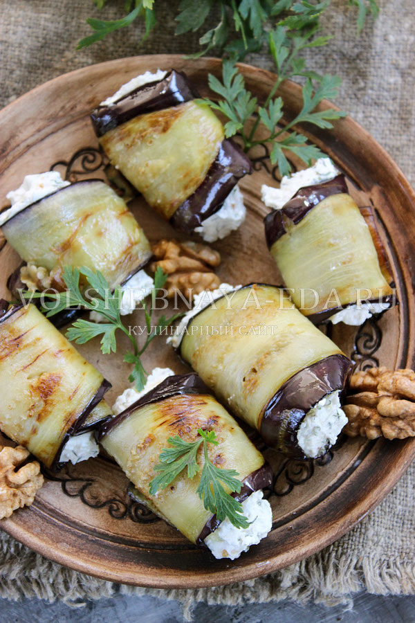 Обжаренные на стороне с растительным маслом баклажаны, после того как они остыли, рискованно смачиваются начинкой, тем самым сворачиваются в красивые рулетики. Для устойчивости рулетики можно заколоть шпажками. Рекомендуется подождать 20-30 минут в холодильнике перед подачей, чтобы вкусings успели соединиться. Перед подачей можно украсить зеленью и орехами.