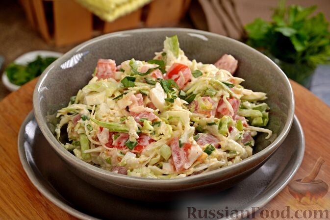 Не обойтись и без лёгких закусок! Салат из молодой капусты с помидорами и плавленым сыром с добавлением отварных яиц быстро готовится и станет отличным дополнением к основным блюдам.