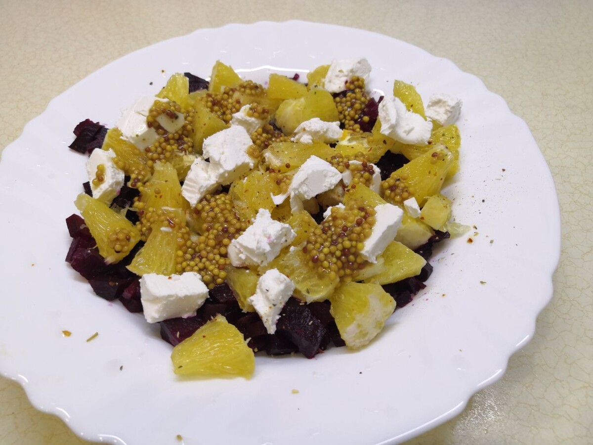 3. На тарелке выложите свеклу, затем добавьте нарезанный апельсин. Посолите и добавьте специи по вкусу. В последнюю очередь добавьте кусочки сыра.