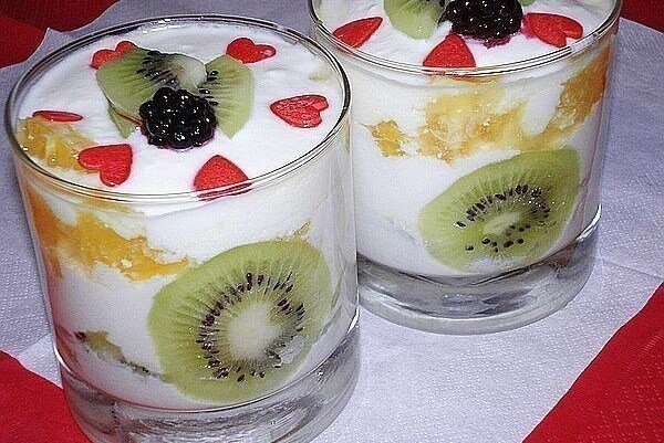 Для начала необходимо в глубокой миске смешать творог, сметану и сахар, тщательно взбивая смесь с помощью блендера до получения однородной массы.Очистить фрукты от кожуры и нарезать их на кружочки, а затем разрезать пополам или на четвертинки по вашему желанию.Затем в небольшую кастрюлю нужно вскипятить 100 мл воды. После кипения добавить желатин, непрерывно помешивая, до полного его растворения.Полученную желатиновую массу влить в творожную смесь и снова хорошо перемешать.В подготовленную форму сначала выкладывается слой нарезанных фруктов, затем заливается часть творожной массы. Слои можно чередовать до тех пор, пока не закончатся все ингредиенты, последним слоем должна быть творожная масса.Украшение десерта осуществляется оставшимися фруктами. Далее десерт ставится в холодильник на 30 минут для охлаждения.Этот легкий в приготовлении десерт сможет порадовать как вас, так и ваших гостей. Подавайте его на праздники или просто в уютный вечер!