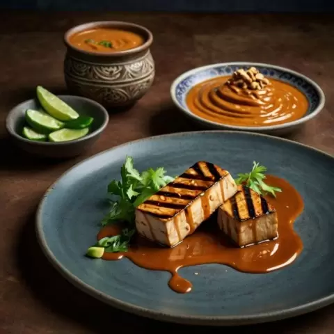 - Маринованный тофу на гриле с арахисовым соусом: Подается с ароматным арахисовым соусом, идеален для любителей пряных вкусов.
