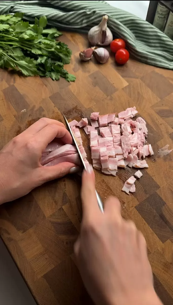 На столе быстро и с минимальными затратами. Грудинку и грибы подрумянивают до золотистой корочки, затем добавляют чеснок и слегка его обжаривают, чтобы раскрылись вкусы. Через мгновение вливают жидкость, влияют специи, засыпают птитим и добавляют сливки. Томатный привкус здесь не нужен — цельный, мягкий кремовый вкус держит баланс между нежностью птитима и мясной насыщенностью.