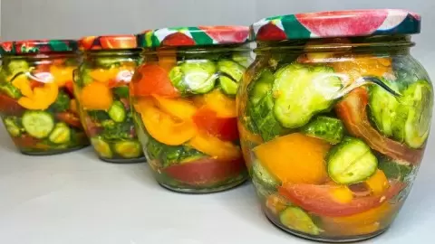 После этого овощи раскладывают по вымытой посуде и заливают маринадом, накрывают чистыми крышками.