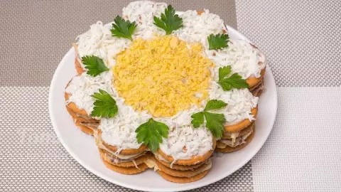 Приготовление этого торт-салата не составит труда, и он подойдет как для торжеств, так и для повседневных обедов. Главное — дать ему время настояться, чтобы крекеры пропитались и все вкусы соединились. Из указанных ингредиентов можно создать два небольших закусочных торта или один большой. Порадуйте близких, создав этот простой и вкусный шедевр!