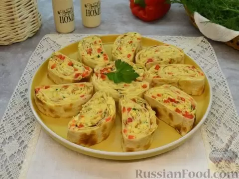 - Рулет из лаваша с омлетом и перцем: наслаждайтесь нежным омлетом, завернутым в хрустящий лаваш. Этот рулет идеально подходит как для завтрака, так и для пикника.