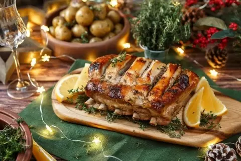 Подготовьте маринад: смешайте 100 мл растительного масла, молотый черный перец, измельченный чеснок, чесночную соль и сок одного апельсина. Все тщательно перемешайте и добавьте листья тимьяна для ароматизации.На корейке сделайте небольшие надрезы, обильно полейте маринадом и втирайте его в мясо. Оставьте мариноваться минимум на два часа.Для глазури соедините 2 ст. л. меда, сок одного лимона и 100 мл растительного масла. Тщательно перемешайте.Оберните корейку в фольгу и запекайте в разогретой до 180 градусов духовке в течение одного часа. Затем приоткройте фольгу и продолжайте запекать еще 60 минут, смазывая глазурью каждые 15 минут.Приготовьте гарнир: отварите картофель до частичной готовности (примерно 10-15 минут). На сковороде растопите сливочное масло и обжарьте картофель до золотистой корочки. По желанию добавьте чесночной соли и листья тимьяна.