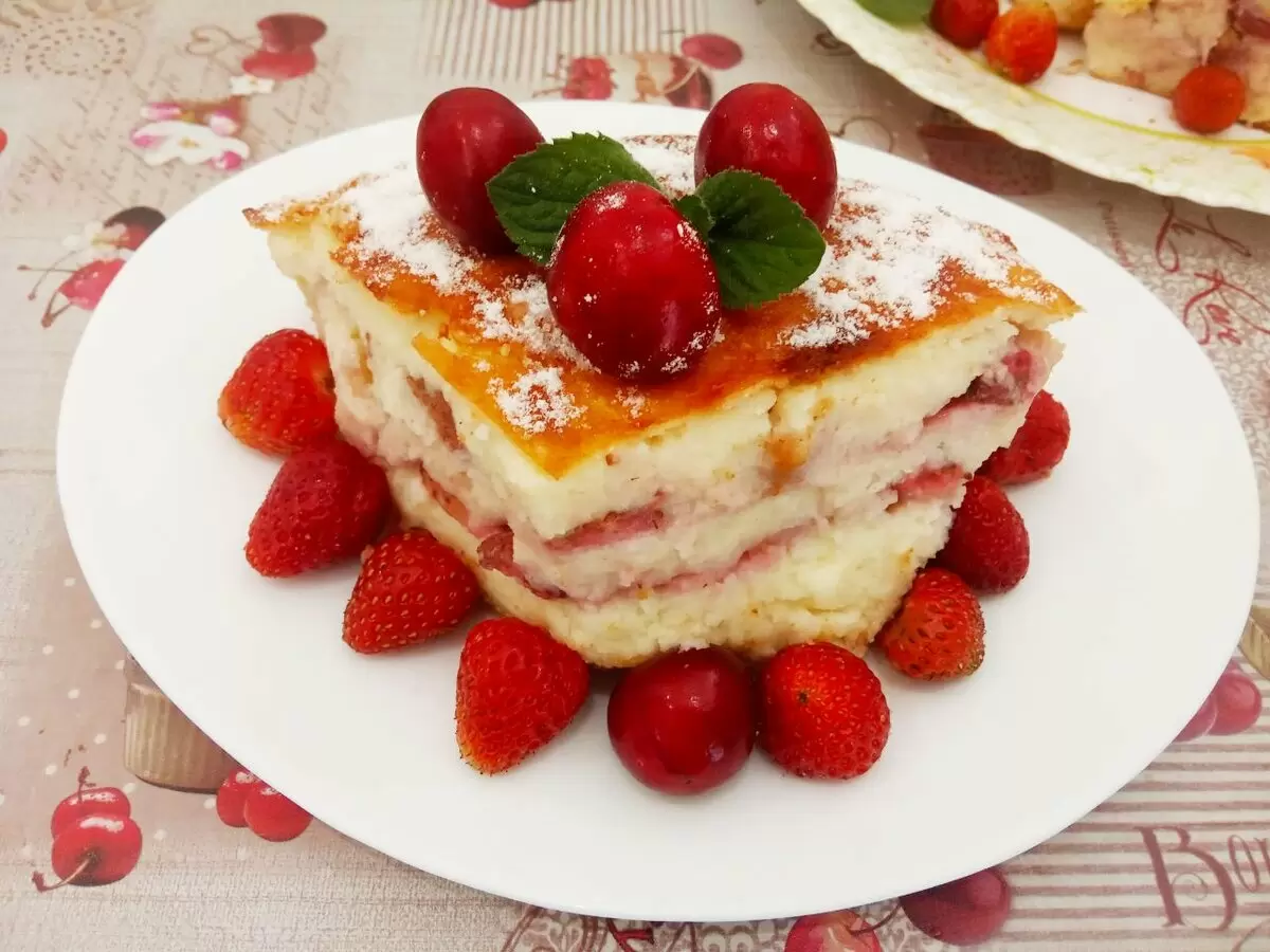 Выкладывайте клубнику равномерно, затем снова накройте частью манной массы и снова добавьте ягоды.