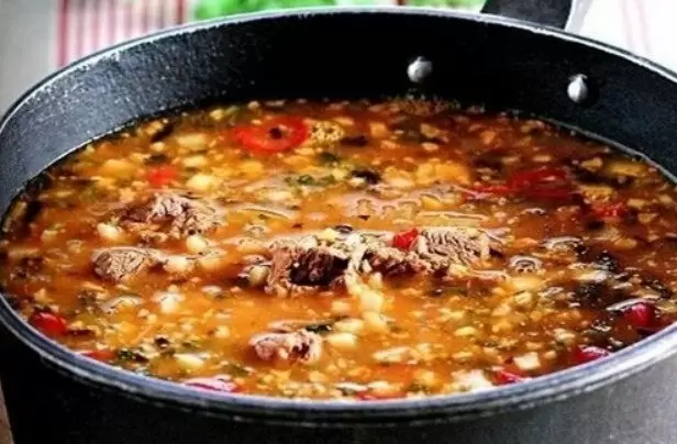 - В суп добавляют обжаренный на растительном масле лук, орехи, соус ткемали или тклапи (из сушеных слив), хмели-сунели, молотый красный и черный перец.
