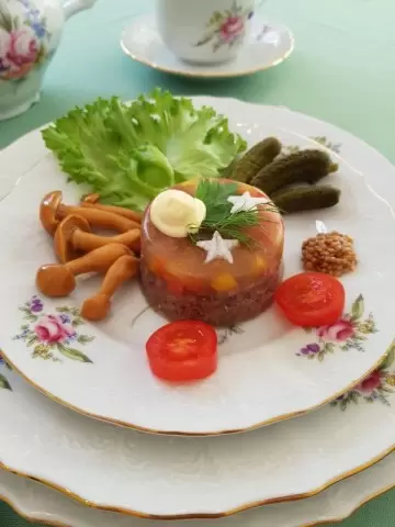 День защитника Отечества – это отличная возможность собраться с дорогими людьми и порадовать их великолепной закуской, которая займет достойное место на праздничном столе. Студень из говядины с овощами – простой и вкусный выбор, который покорит сердца ваших гостей.