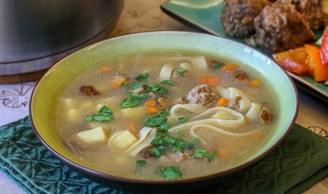 В это время из мясного фарша сформируйте маленькие фрикадельки. После того как суп закипит снова, добавьте картофель, поварите еще 10 минут. Затем добавьте фрикадельки и лапшу, отрегулируя её количество в зависимости от желаемой густоты супа. Приготовьте до тех пор, пока фрикадельки не всплывут, а лапша не станет мягкой.