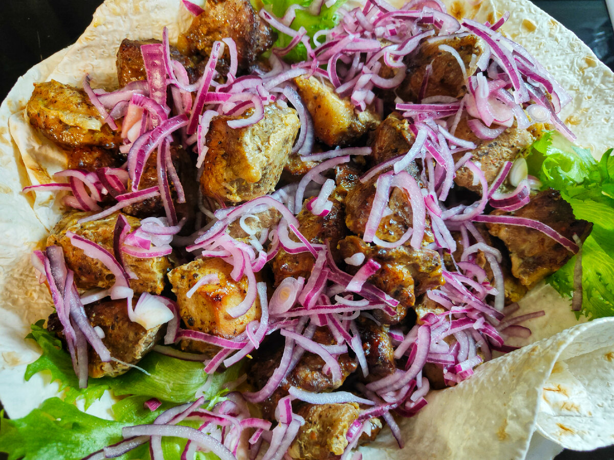 Готовое мясо следует подавать на большую тарелку, застеленную лавашем. Сверху необходимо посыпать свежим луком, нарезанным кольцами, и зеленью. Если кто-то не переносит кинзу, допустимо заменить ее другой зеленью или оставить лишь лук.