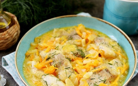 К овощам добавляется жирная сметана, и смесь доводится до кипения. Создавая небольшие углубления в маринаде, в них выкладывается обжаренная рыба. Далее готовить надо на тихом огне, накрыв крышкой, около трех минут. В конце процесса рыбу следует посолить и поперчить по вкусу. Благодаря муке, которая осталась на рыбе, соус получится приятно густым.