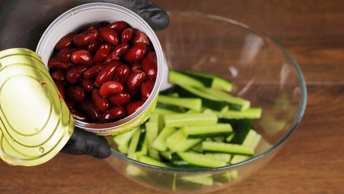 Следующий шаг — нарезка свежего огурца на длинные брусочки, которые помещаются в большую миску. Остывшую курицу советуется также нарезать на небольшие кусочки и добавить к огурцам. Необходимо слить жидкость из банки с консервированной фасолью и добавить ее в салат. Также в емкость отправляется отцеженная корейская морковь. По вкусу добавляются соль и перец, а для завершающего штриха салат закладывается двумя ложками майонеза.
