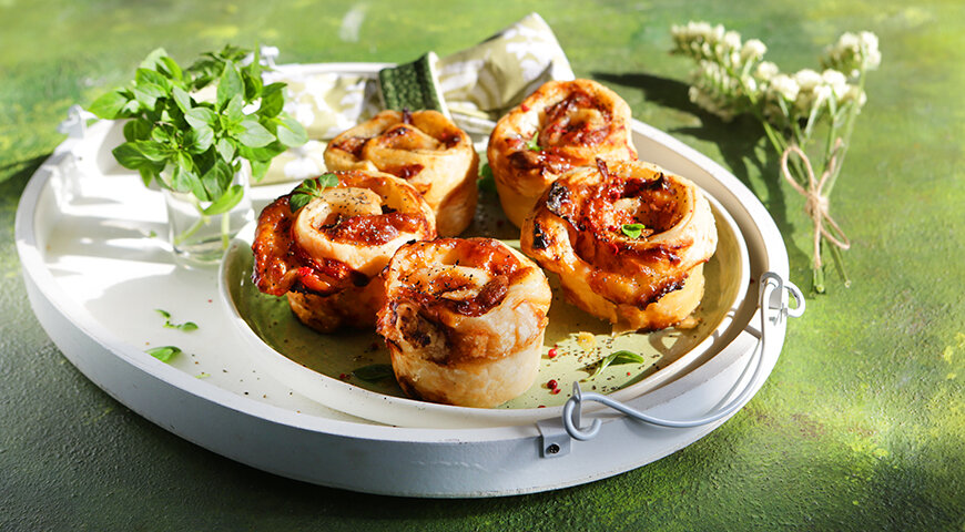 Шаг 3: Закрутите полоски теста в рулетики и разместите в формочках. Выпекайте на среднем уровне духовки в течение 20-25 минут. Переложите закуски на блюдо и подавайте горячими.