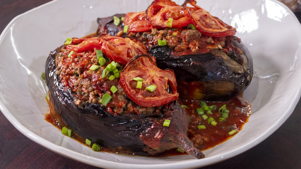 Фаршированные баклажаны с бараниной и острым соусом