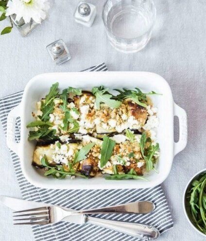 Шаг 3: После запекания баклажанов, каждый кусочек заворачивать в козий сыр, формируя аккуратные рулетики. Сложить их в форму для запекания и полить сверху приготовленным соусом.