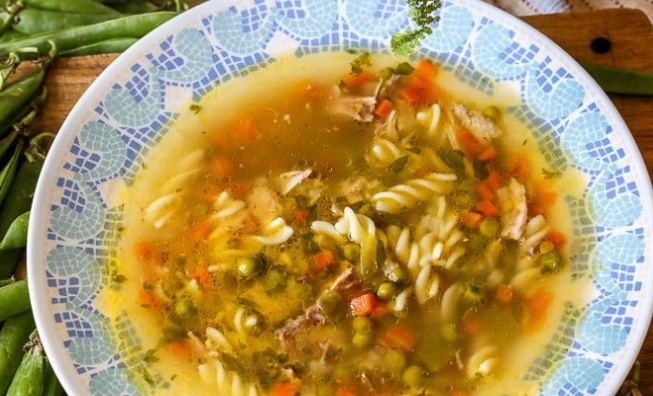 Начните с приготовления бульона. Для этого отлично подойдет мясной бульон на основе говяжьих ребрышек. Все овощи тщательно вымыть и очистить. Лук нарезать мелко, сельдерей очистить от грубых волокон, а морковь и стебель сельдерея порезать на маленькие кубики. Стручки зеленого горошка необходимо распотрошить.