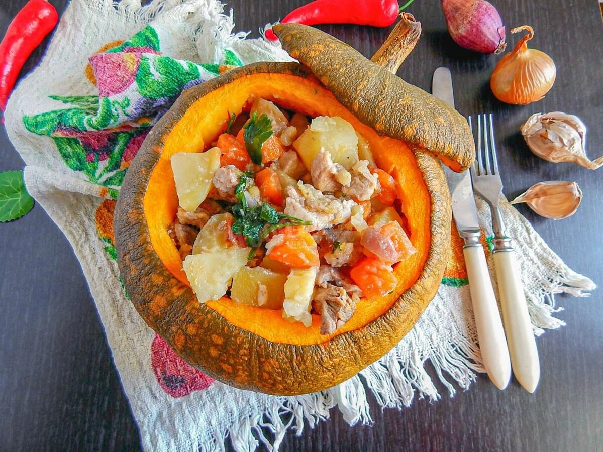 Подготовка тыквы: Тщательно вымойте тыкву и обсушите. Срежьте верхушку, как крышку. Это станет «крышкой» для запекания, которая поможет сохранить сочность начинок.Очистка: Удалите мякоть и семена – это можно сделать ложкой. Повторно промойте внутреннюю часть тыквы.Приготовление начинки: Мясо нарежьте кубиками, картофель и морковь – также, по желанию, можно нарезать соломкой или кружочками. Лук следует очистить и нарезать кубиками.Фаршировка: Внутрь тыквы аккуратно уложите мясо и овощи. Посолите, поперчите и добавьте оливковое масло. Хорошо перемешайте.Запекание: Накройте тыкву «крышкой», смажьте форму растительным маслом, добавьте немного воды, чтобы не подгорало. Установите тыкву в разогретую до 180 градусов духовку на 40 минут, ориентируясь по готовности мяса.Подача блюда