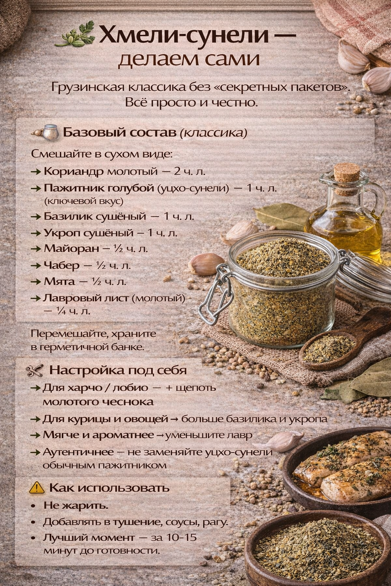 Хмели-сунели — это не просто приправа, а настоящий кулинарный шедевр, который можно создать самостоятельно в домашних условиях. Зачем вам секретные смеси, если можно приготовить всё честно и просто?