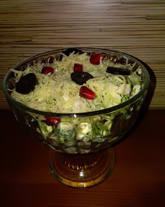 Первые шаги — разморозить брокколи в микроволновке и слить лишнюю жидкость. Далее курицу порезать на небольшие кусочки, сыр натереть на крупной терке, а чеснок пропустить через чеснокодавилку. Размороженную брокколи также необходимо мелко нарезать (отбросьте мысль о варке — свежесть и хруст брокколи придадут салату особую пикантность).