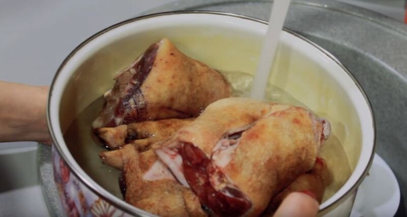 - Промывание: После замачивания, мясо обязательно нужно хорошо промыть, чтобы удалить грязь и волоски — это существенно улучшит внешний вид блюда.