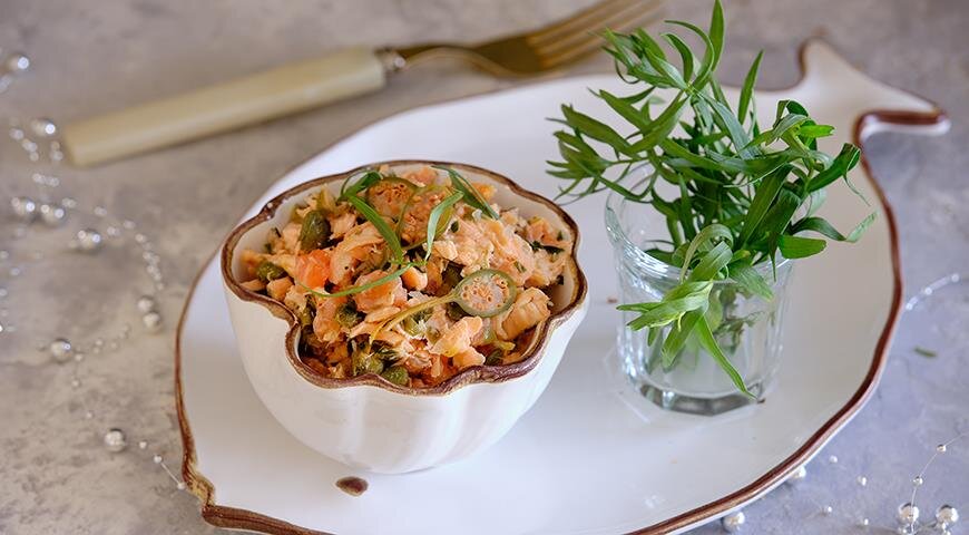 3. В блендер добавить все компоненты: оба вида лосося, обжаренный шалот, каперсы, тархун, лимонный сок и цедру. Приправить солью и перцем по вкусу.