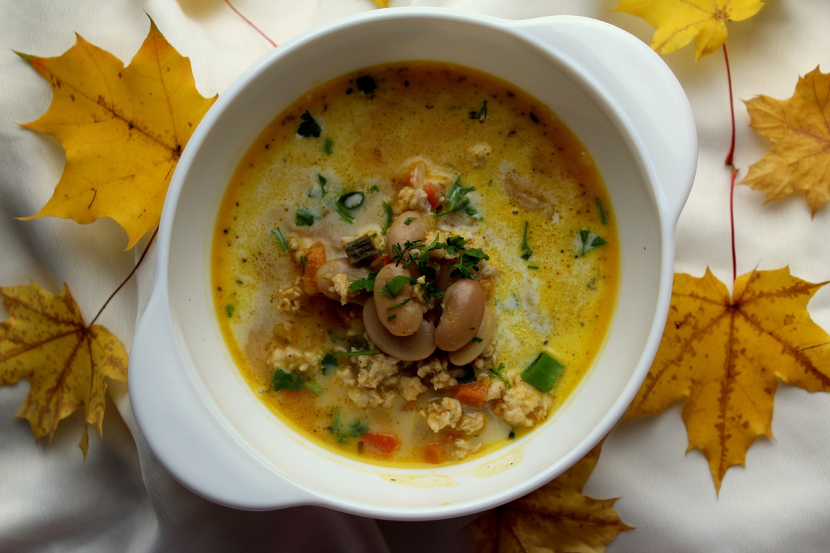 К овощно-мясной смеси добавьте пюре из тыквы, фасоль и бульон, присолите по вкусу. Доведите суп до кипения и варите в течение 20 минут. Сливки добавьте непосредственно перед подачей – по вкусу в каждую тарелку.