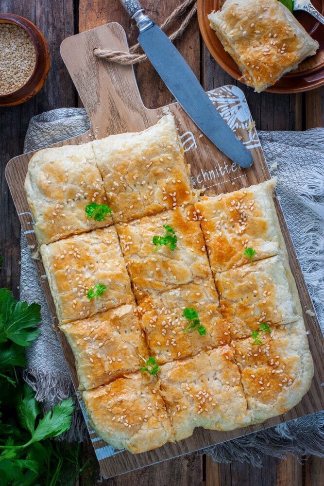 Смажьте верх пирога яйцом и посыпьте кунжутом. Выпекайте в разогретой до 180 °C духовке в течение 40 минут. Ваш пирог готов!