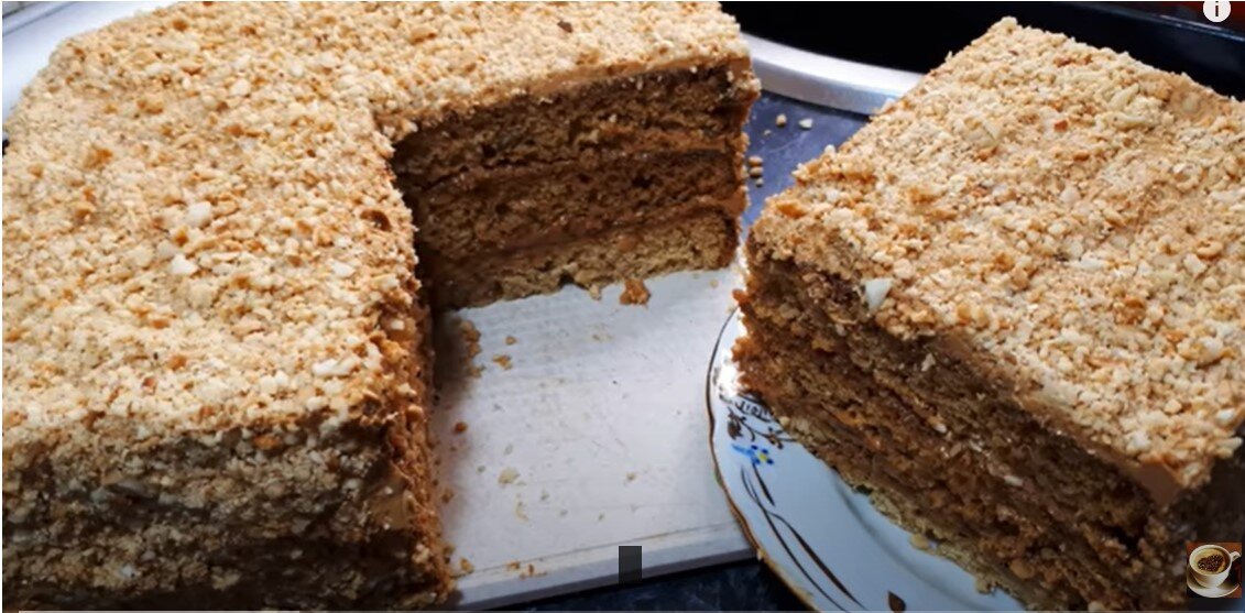 Для пропитки коржей вам понадобятся мед, вода и, по желанию, коньяк. Коржи, после остывания, нужно пропитать сиропом и обмазать кремом. Затем стоит украсить верх и бока торта орехами для завершающего штриха.