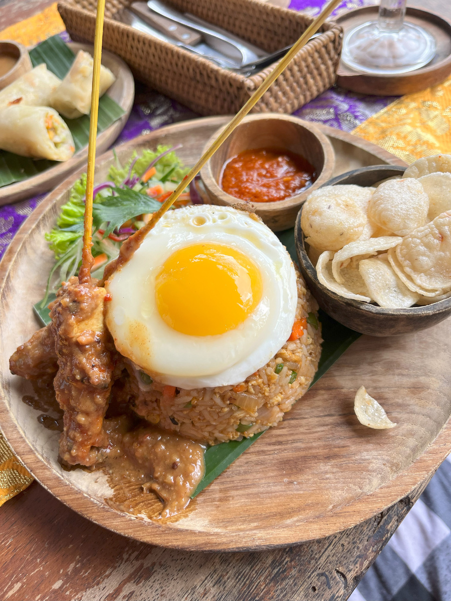 - Nasi Goreng — Это популярнейшее индонезийское блюдо, в основе которого жареный рис с разнообразными добавками и ароматными специями. Даже если рис не является любимым продуктом, это блюдо легко может изменить ваше представление о нём. Особенно впечатляет его подача с глазуньей и креветочными чипсами в ресторанах, таких как Sun Sun Warung и Layana Warung в Убуде, где также открываются великолепные виды на водопад.