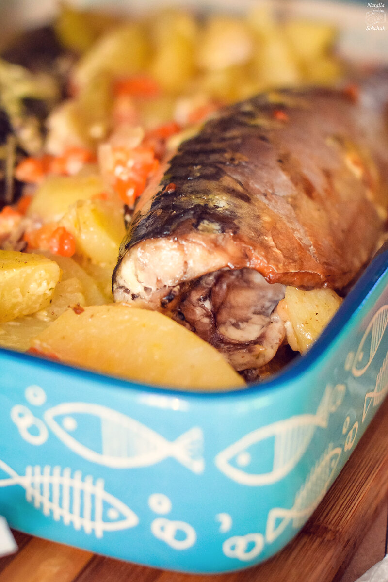 Накройте форму фольгой и ставьте в заранее разогретую до 200 градусов духовку на 1,5 часа. Спустя полчаса полейте картошку немного водой для сочности. После этого снова накройте фольгой и продолжайте запекать. За 30 минут до окончания уберите фольгу, чтобы скумбрия и овощи подрумянились.