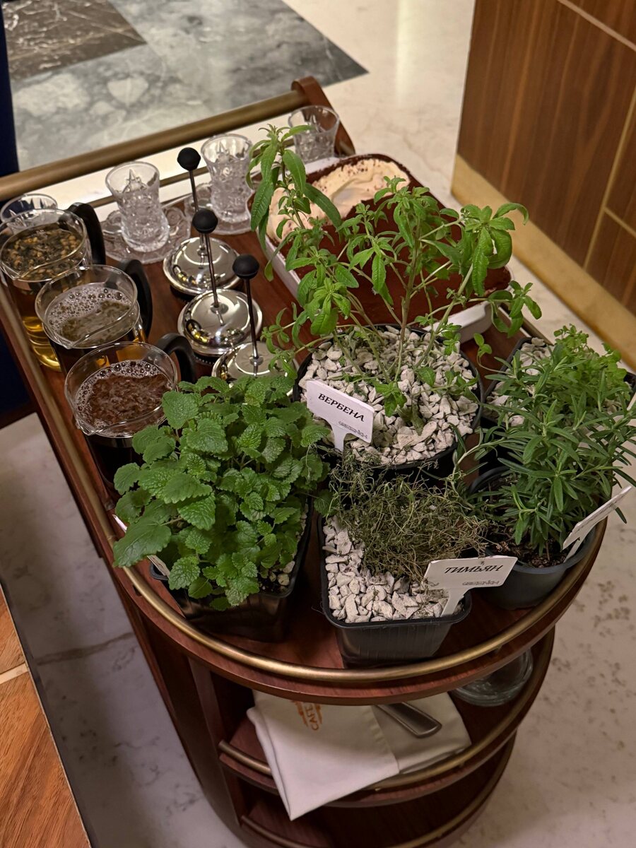 В рамках церемонии посетителям предлагается добавить к своему чаю разнообразные ароматные травы с эффектной тележки: мята, тимьян, розмарин и вербена. Каждый глоток перенесет вас в мир приятных воспоминаний — будь то летние вечера на даче с мятой прямо с куста или теплые разговоры с бабушкой. Этот уникальный опыт создает настоящую атмосферу уюта, за которой так часто приходят в рестораны, но редко находят.