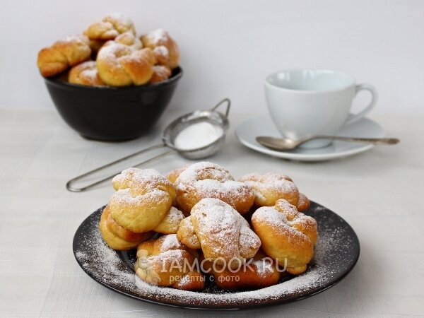 Разделите полученное тесто на две равные части и скатайте каждую в колбаску. Нарежьте колбасу на небольшие кусочки, а затем каждый кусочек сформируйте в жгутик и завяжите в узел.