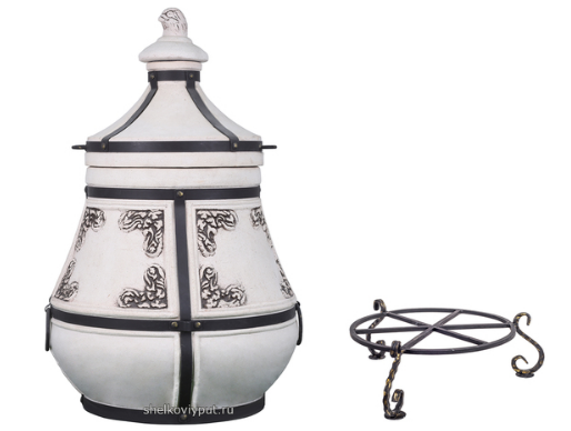 Стильный корпус тандыра из шамотной глины украшен орнаментом, а для безопасности он обрамлен металлической полосой. В комплект также входят все необходимые аксессуары.
