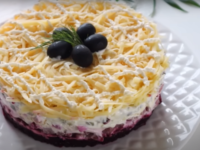 Для завершения приготовления создайте сетку из майонеза на верхнем слое салата, украсьте оливками, маслинами и свежей зеленью. Дайте блюду настояться в холодильнике около часа. После этого аккуратно уберите сервировочное кольцо и подавайте к столу.