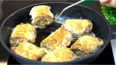 3. Для обжаривания взбить два яйца с щепоткой соли, а на сковороду налить растительное масло. Рулеты обмакнуть в яичную смесь и выложить на разогретую сковороду.