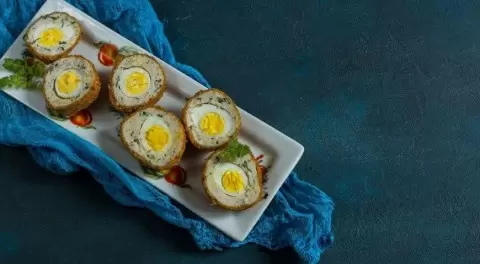 Эта традиционная британская закуска, известная как яйца по-шотландски, идеально подходит для неожиданных гостей. Их можно подготовить заранее и просто достать из холодильника, когда это понадобится. Яйца, завернутые в мясо, с красивым разрезом и зеленью станут настоящим украшением любого стола.