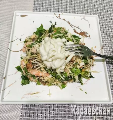 В завершение соединить все ингредиенты в одной посуде, добавить немного соли и заправить домашним оливковым майонезом. Данный салат не только порадует вас оригинальным вкусом, но и станет отличным источником полезных веществ, необходимых организму.