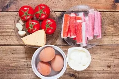 Подготовка ингредиентов: Крабовые палочки достать из морозилки и дать им разморозиться. Чтобы облегчить процесс очистки, стоит подержать их над паром. Яйца отварить вкрутую, остудить и очистить.