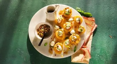 Абрикосы с моцареллой, фисташками и бальзамическим уксусом – это оригинальное сочетание, которое идеально подходит для легкого перекуса или как закуска на дружеской встрече. Сочетание сладкого и соленого в этом блюде завораживает своим вкусом. Ароматная моцарелла, хрустящие фисташки и кисло-сладкий бальзамик хорошо подчеркивают сочные абрикосы, создавая уникальное гастрономическое произведение.